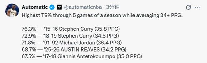 纪录五:前五场场均至少拿到34分,里夫斯真实命中率68.7%历史第三,仅次于库里和乔丹;